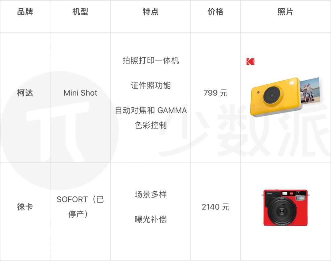 徕卡 Leica:于 2016 年发布徕卡 Sofort 系列,造型方正,相纸规格与富士的 Instax Mini 系列相同(放入 Instax Mini 的相纸也可以正常使用),但是在 2020 年便停产了,不过仍可以在第三方或者二手市场淘到。