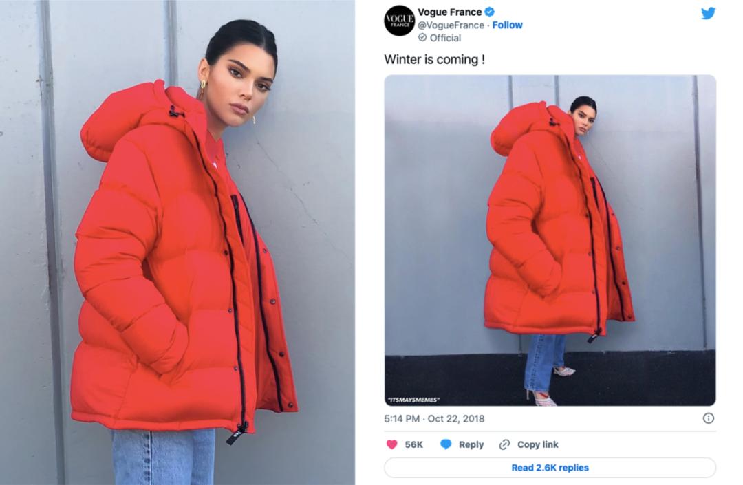 △ Kendall Jenner夸张比例外套Meme(来源:The Mirror,Vogue France)