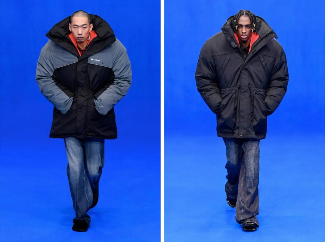 嘻哈文化与宽松廓形的联系可能涉及人口贫困和监狱文化(e.g. Baggy Pants),本文暂不作赘述。虽然嘻哈文化和运动风潮或许能够解释羽绒服品类如何得以复兴,但是它们似乎无法全然解释时尚界的更为普及的“体积竞赛”。事实上, 这种膨胀美学,尤其对于街头时尚,似乎具有品类普适性——Balenciaga的夸张廓形不限于外套 。