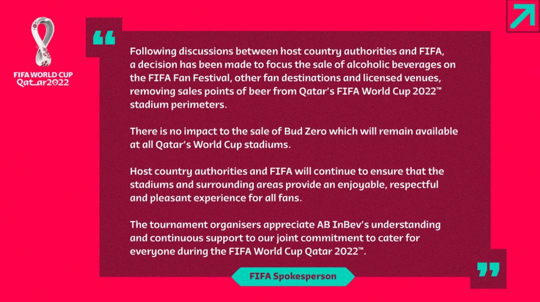 值得一提的是,在这份声明发出之前,卡塔尔世界杯组委会已经基于一系列要求,同意了在世界杯期间售卖酒精饮料。例如球迷可以在开赛前3小时、赛后一小时之内及特定区域购买啤酒。但就在比赛即将开打之时,他们的态度发生了180度大转变,也有了上述FIFA发出的那份声明。