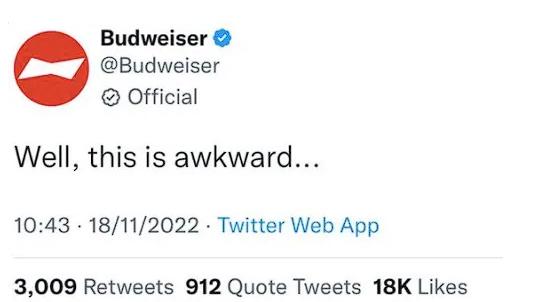 而这种突然变卦,也让百威公司措手不及。在声明发出后不久,其官方推特账号发推表示——诶....这下尴尬了.....。虽然这条推文目前已经删除,但我们也可以感受到百威官方对于「禁酒声明」的无奈。