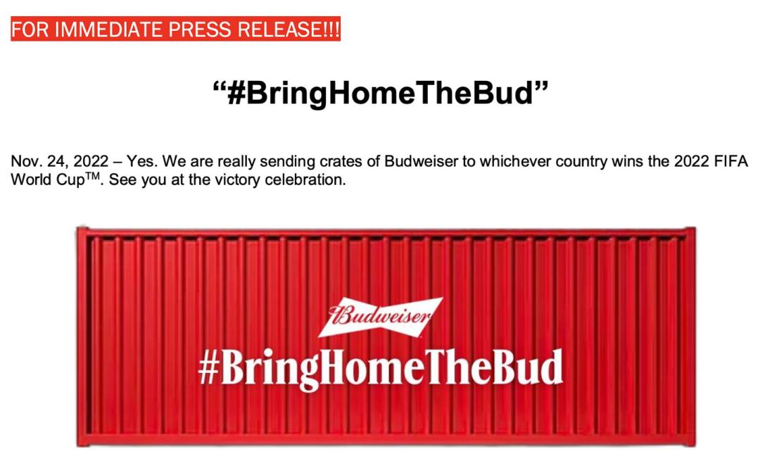 禁酒声明发出的第二天,百威就晒出卡塔尔仓库中的啤酒存货,表示会将其送给夺冠队伍。同时,百威也发起了一项全新的营销活动——「BringHomeTheBud(将百威带回家)」。
