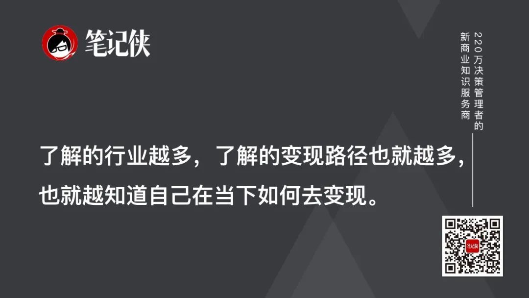 一个老板在一个行业呆得越久,就越容易画地为牢,越缺乏跨行业、跨界的思维。了解的行业越多,了解的变现路径也就越多,也就越知道自己在当下如何去变现。