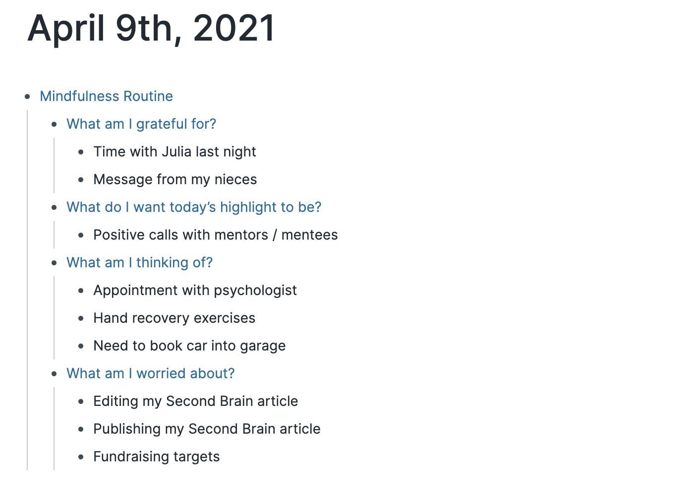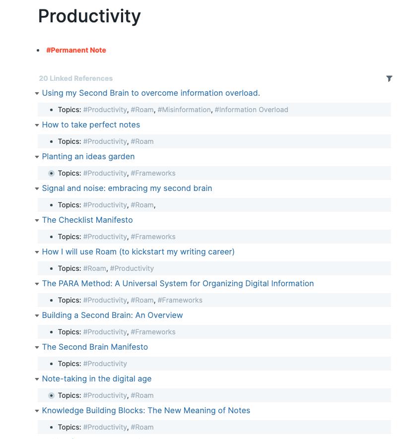 一开始这只是一个想法的种子,一个来自于 web 的引用书签。后来,它变成了对我的第二大脑处理过程的描述,相当的枯燥。不过,当我浏览相关的条目,按照之前隐藏的连接顺藤摸瓜,漫游到生产力和正念时,我发现了这个:2020 年 10 月的日记项。