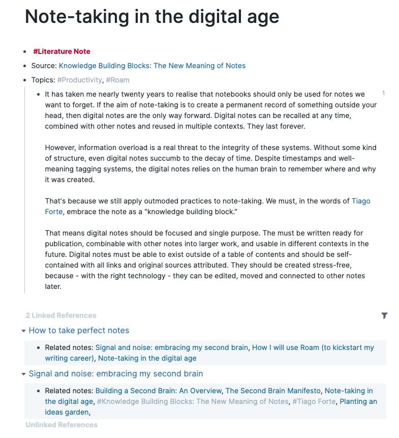 添加上下文。我用 Roam Research(我的笔记应用)通过给笔记添加链接和来源,让笔记不会过时。我会进行总结并建立摘要,每天只需花五分钟的时间,不时地修修补补来增加价值。