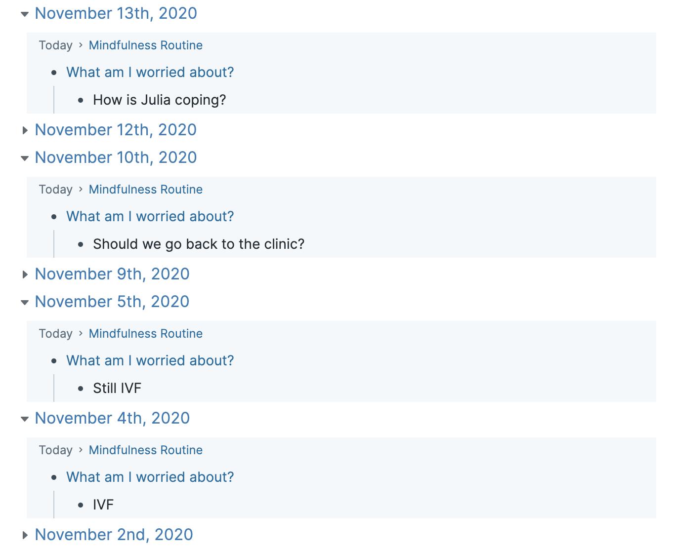 2020 年 11 月,当我回去翻阅过去的日记时,我注意到自己经常会担心试管婴儿的事情。因为工作压力很大,我没有意识到定期去医院就诊遭遇失望带来的挑战。但这些情况因为日记而浮出水面。不久之后,我和妻子决定去看心理医生,好让我们有空间来坦然接受我们的经历。