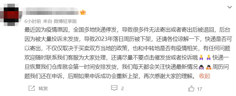 燃次元获悉,某商家售卖的2023年周历,因全国多地快递停发,很多订单无法寄出或者寄出后被退回,被许多消费者投诉不发货,导致该周历被下架。12月3日,该商家特意发布微博解释,“快递一旦恢复,我们仓库就会第一时间安排发货。周历问题我们还在申诉,后期如果申诉成功会重新上架,再次感谢大家的理解。”