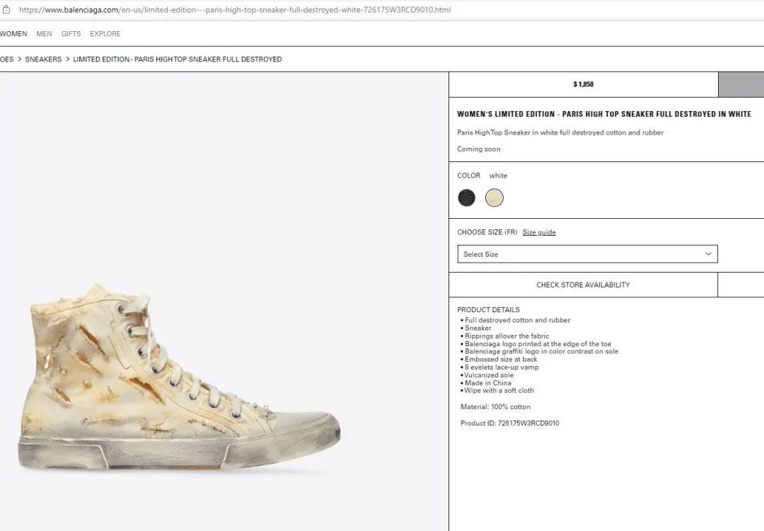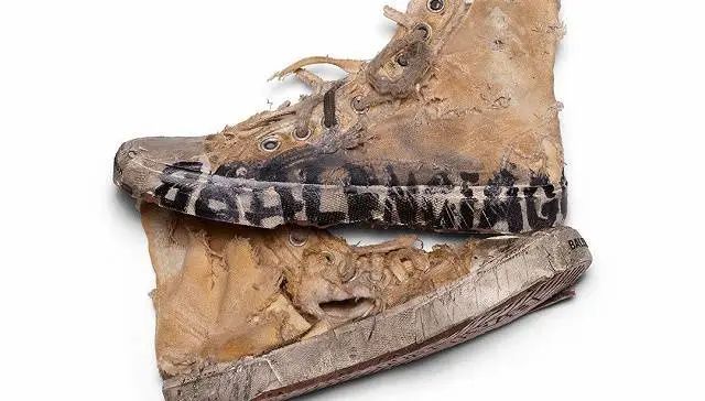 当然,如果你觉得售卖的脏脏鞋实在是太普通了,你也可以买 Balenciaga 广告中破损严重的「仿百年运动鞋」。穿肯定是不可能穿的了,但是 1800 美元(近 12700 人民币)的限量版球鞋价格说不定也有社交名片价值和展览作用。
