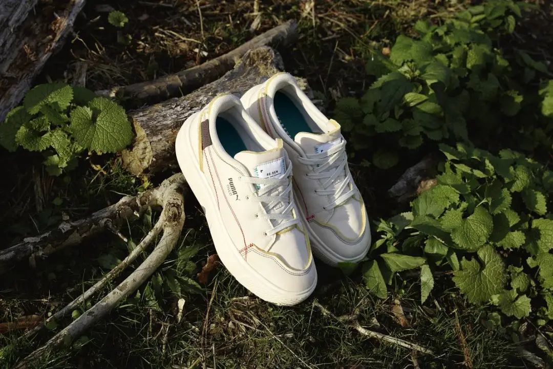 PUMA 推出的燕麦米色厚底鞋运用了经典的 Oslo City 设计,同样是用废弃材料,但它用的是成衣制程中常见的剩余棉布、皮革以及回收宝特瓶再制塑料等废弃原料。