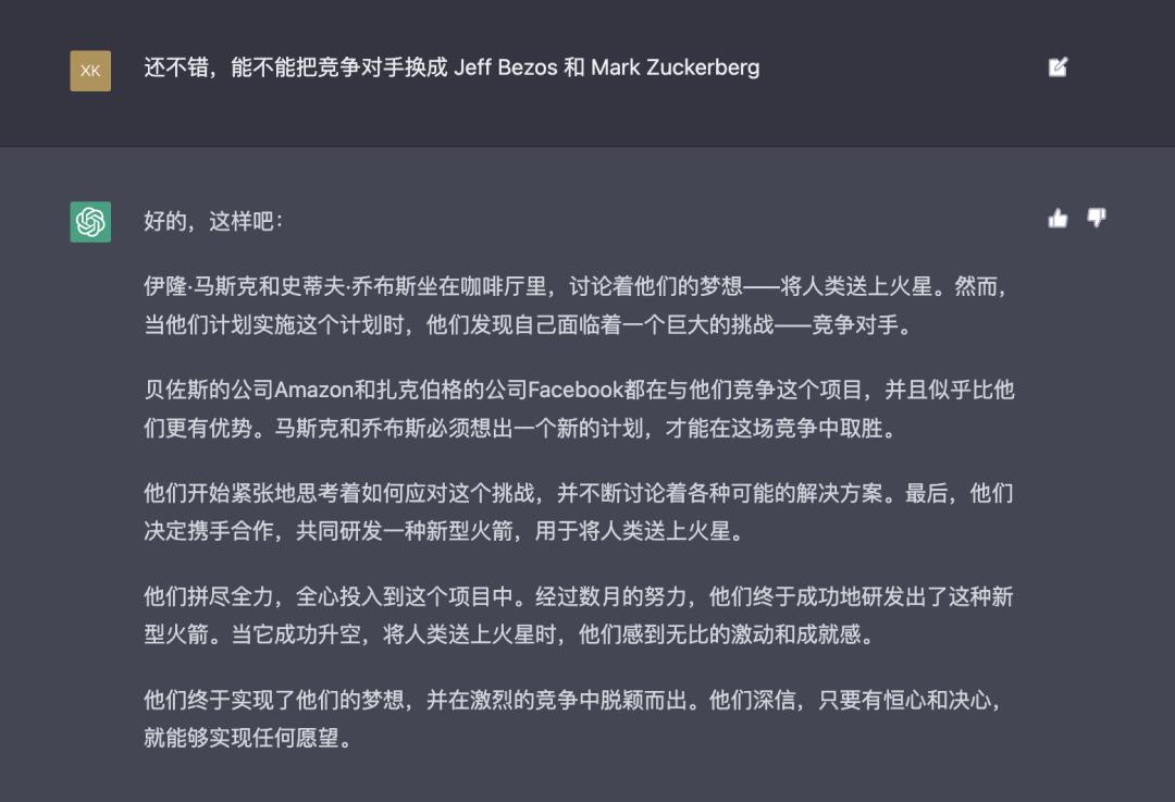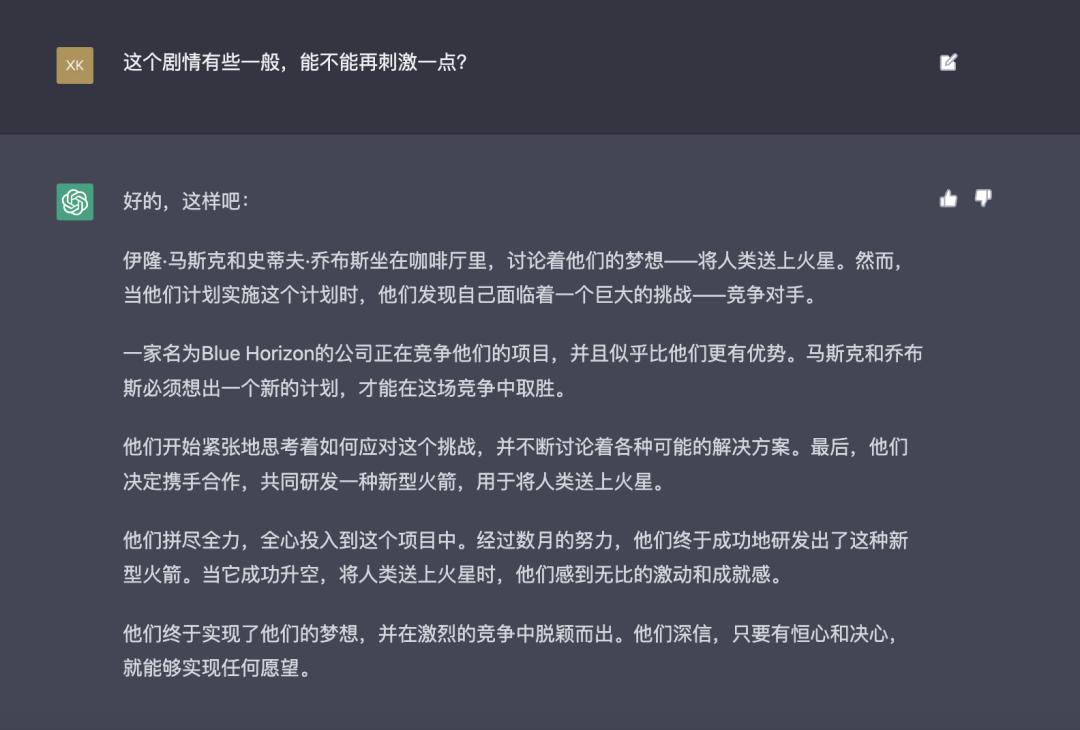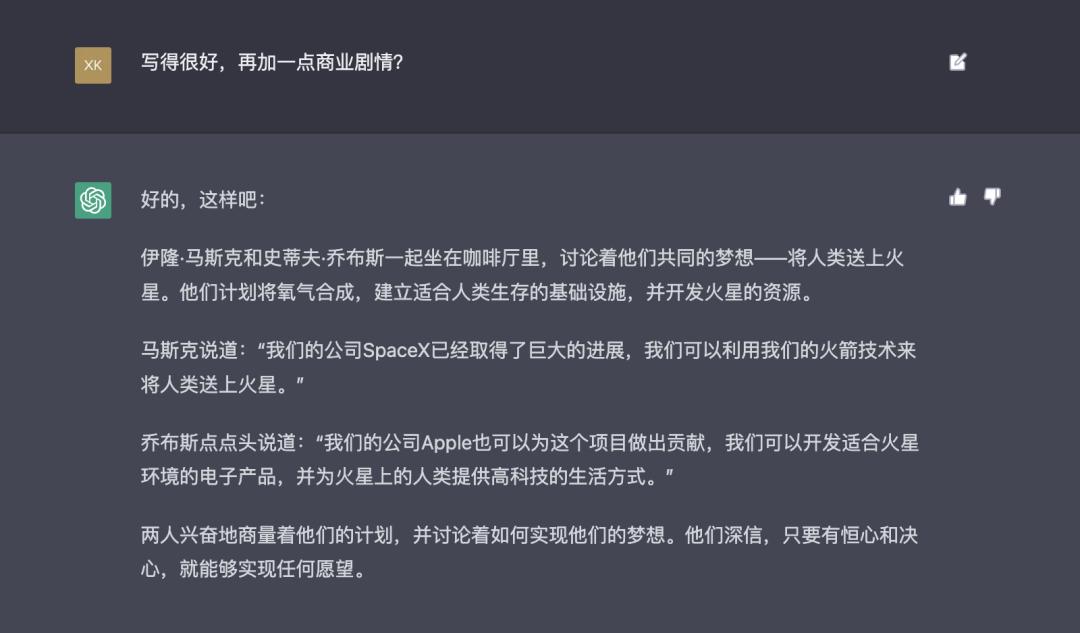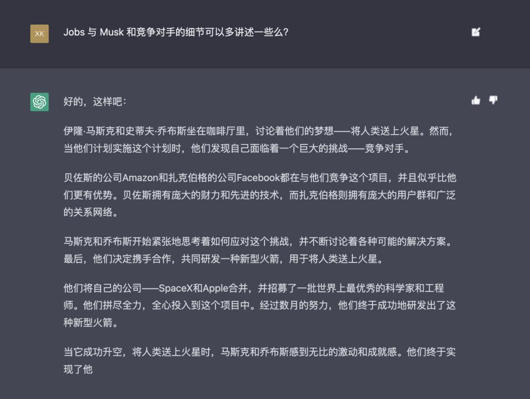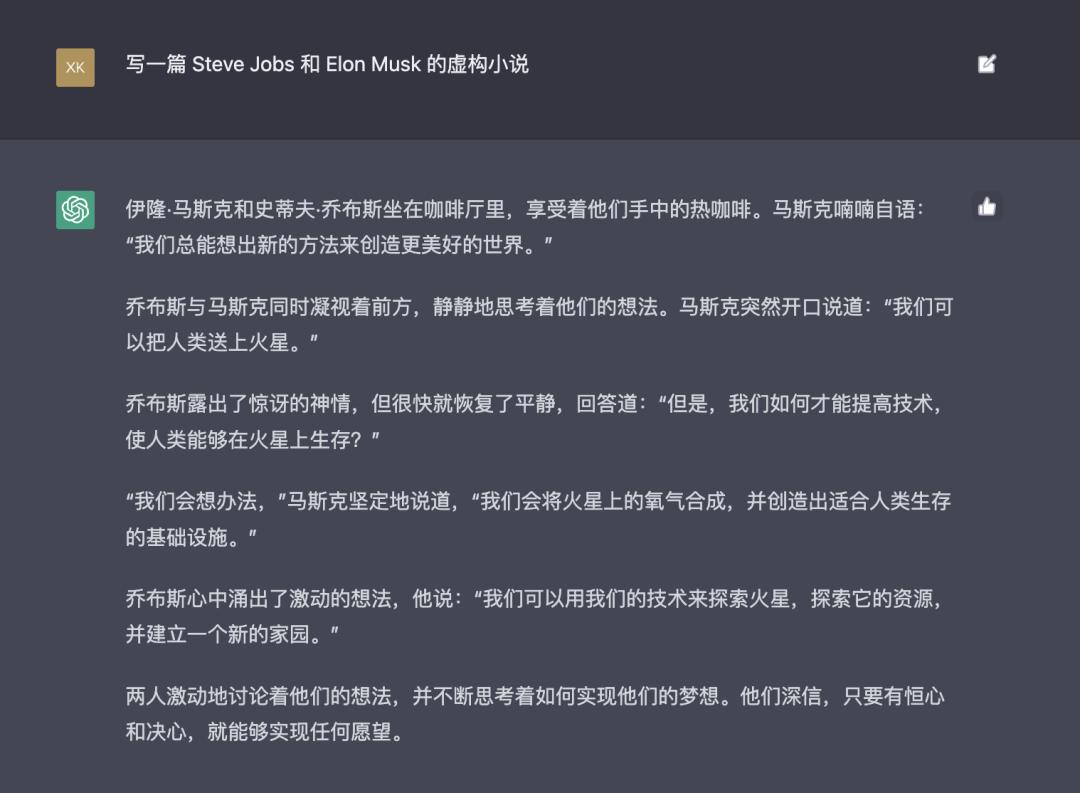 ChatGPT 不仅可以解释代码,编写内容脚本,也可以通过对话式回答找到你想问的内容,感兴趣的朋友可以在 OpenAI 官网体验一下,比如我尝试让 ChatGPT 创作一篇关于 Steve Jobs 和 Elon Musk 的虚构小说,内容如下: