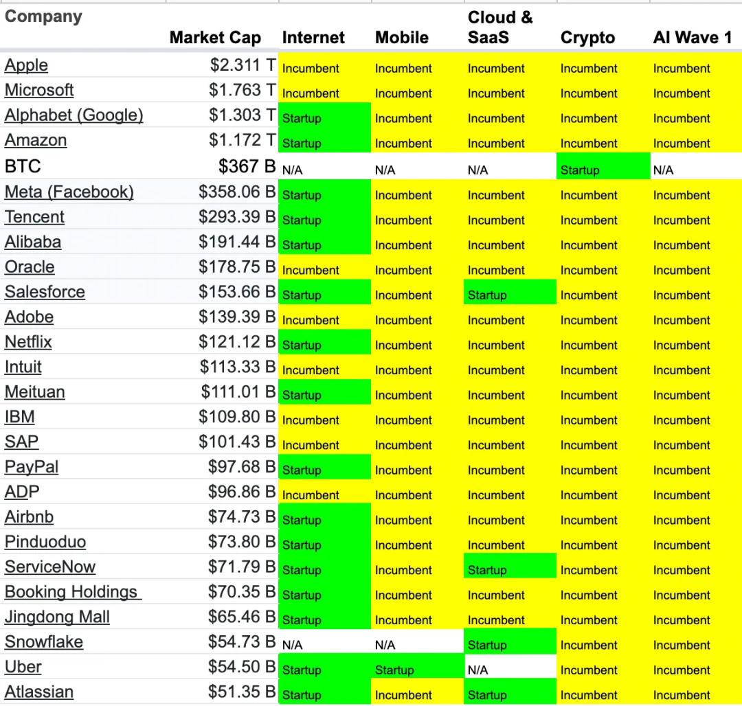文中 Elad 谈到了在每一次技术浪潮中,初创企业(Startup)和现有企业(Incumbent)在价值、营收、估值、利润以及人才等多个维度各不相同,在一部分浪潮中初创企业是 100% 的受益者,在另一部分浪潮中现有企业是主要的受益者,Elad 认为上一波 AI 浪潮主要的受益方是现有企业。
