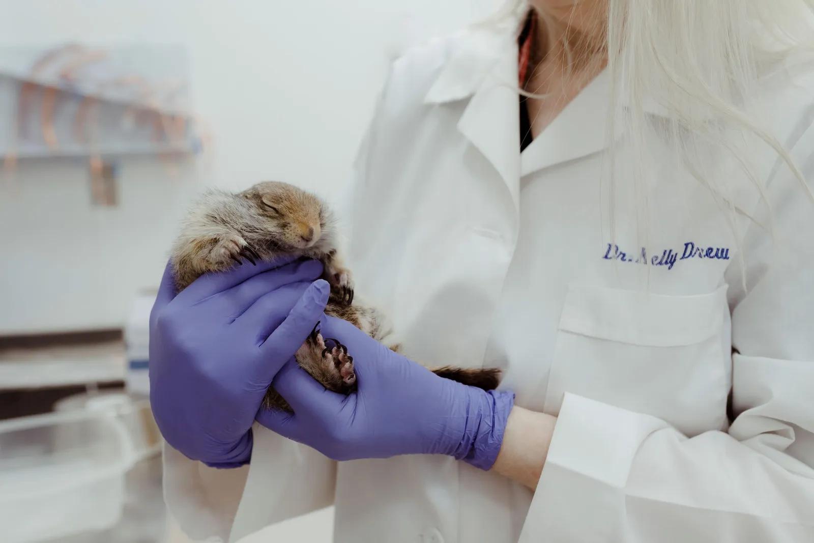 费尔班克斯,阿拉斯加大学。凯利·德鲁正在她的实验室里抱着一只北极地松鼠。摄影:MARY WEBB