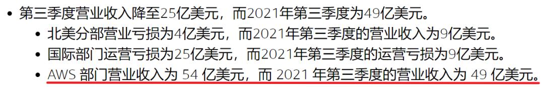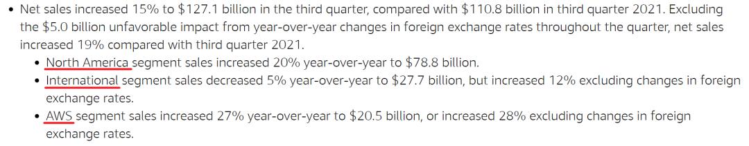 而在 2022 年度第三季度的财报上,AWS 部门的销售额有同比 27% 的增长。另外两个则分别是增长 20% 和下降 5% 。