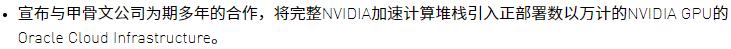 而就在今年,甲骨文宣布将会展开多年与英伟达的深度合作,把英伟达加速计算和 AI 训练等技术带到 OCI 上面。