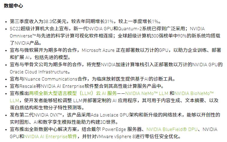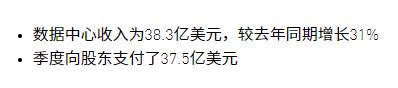 财报上说,数据中心在第三季度的收入为 38.3 亿美元,较去年同期增长 31% ,较上一季度增长 1% 。
