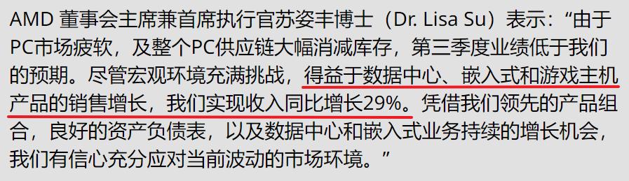 就连大家直呼 YES 的 AMD ,在面对疲软的 PC 市场表现时,苏妈也要在财报里夸一句数据中心业务有所增长。