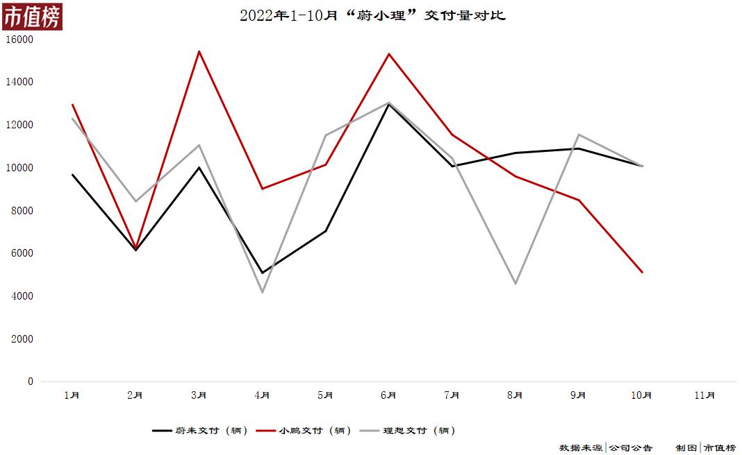 据中汽协数据,今年前10个月,新能源汽车产销分别完成548.5万辆和528万辆,均同比增长1.1倍。同期,蔚小理的交付量增速分别为32%、56%、54%。