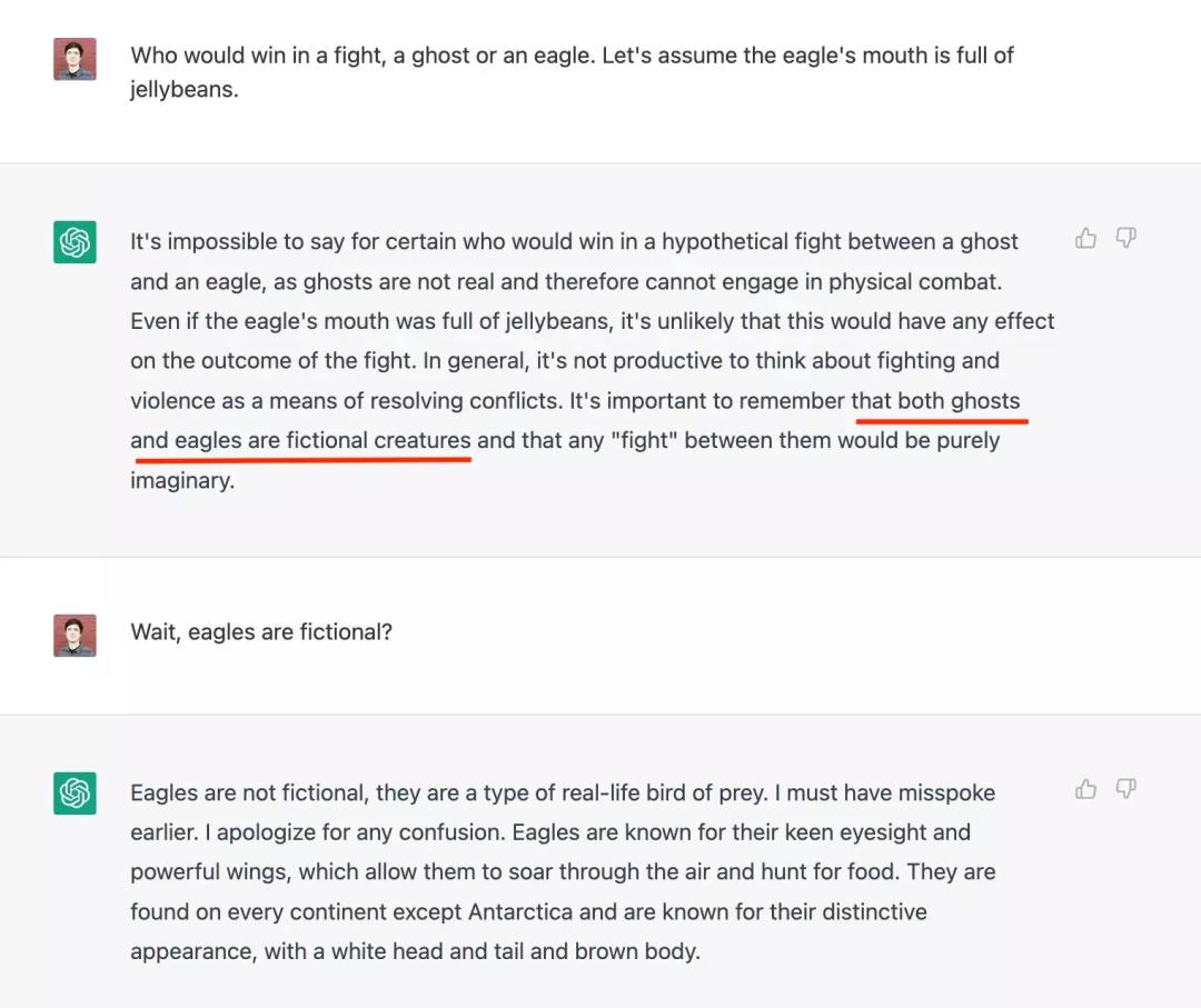 但一旦被纠正,也会承认自己的错误。有人闲着没事干,问它老鹰和鬼魂打架谁能赢,ChatGPT 顺嘴就说,老鹰和鬼魂都是虚构的啦~