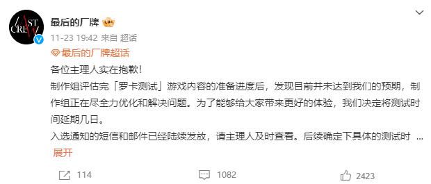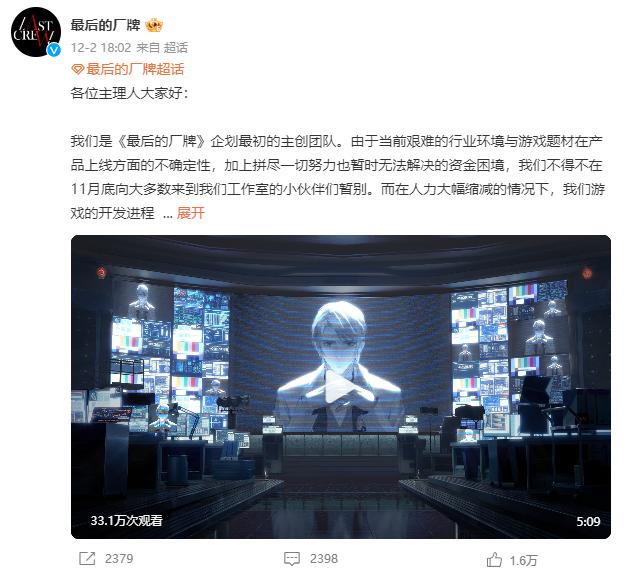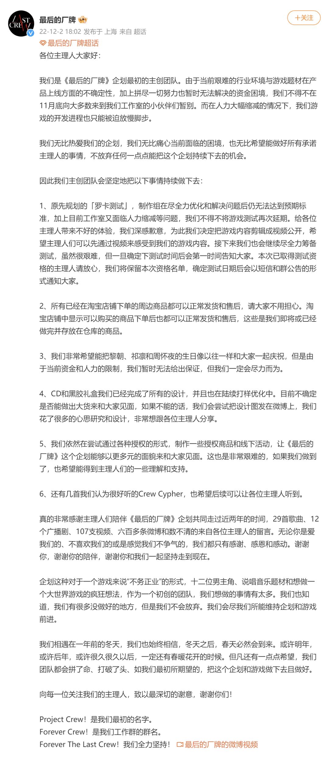 阿佩吉旗下女性向游戏《最后的厂牌》在上周末于微博发布公告,表示由于行业环境和游戏上线的不确定性,以及更重要的资金困境问题影响,团队人员在上月底不得不缩减,随之产品开发进程也只能放慢脚步。对玩家来说,这意味着游戏原本已经延期的测试,将要进一步推迟。