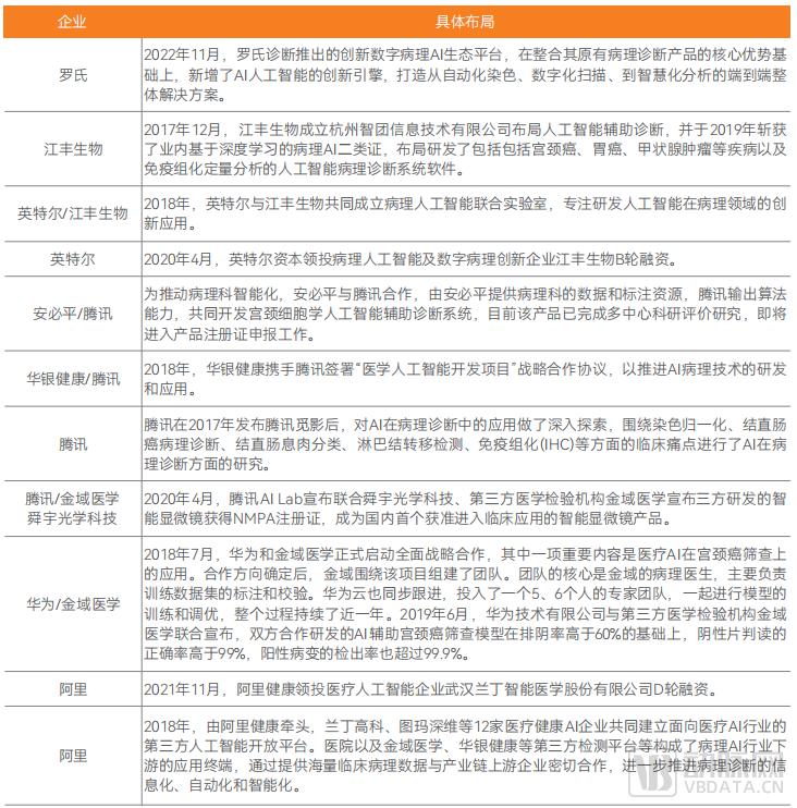 由于看好病理AI产业的发展前景,除了病理AI 初创企业本身,智慧病理产业的上下游企业也纷纷布局病理AI软件系统的研发、互联网科技巨头也参与其中。