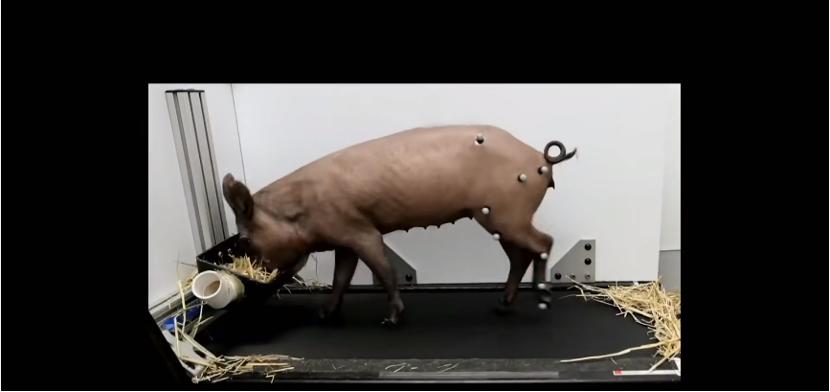 这是一只在跑步机上行走的猪,脊髓里也有一个植入体。我们可以通过这个设备传输神经数据,用这些设备来做实时的解码运动。这个是猪的髋关节,正在按照时间的序列移动。通过刺激关节和神经,可以产生不同的动作,我们可以记录这些运动的强度、力量和特殊性。通过解析这些记录,我们就能通过植入的N1芯片模拟大脑的信号,刺激身体的肌肉做出反应。