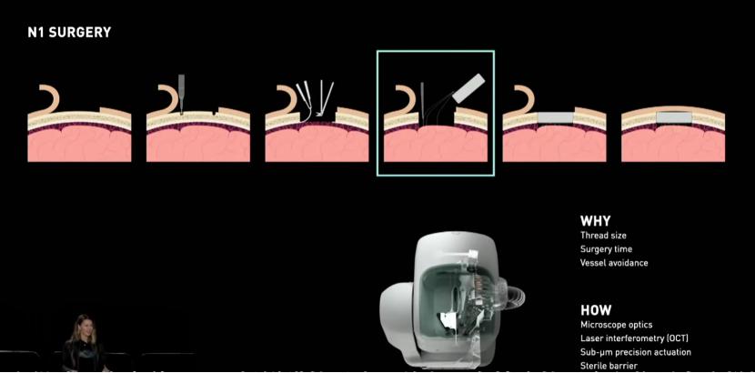 在这个过程中,我们要做以下几个事情:钻开并切除颅骨,去除坚硬的脑膜外层,然后插入电极的细线,将植入物放入,缝合切口。就这样,你的皮肤下面有了一个植入物。