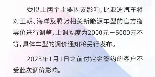 比亚迪率先出手,从明年1月1日起比亚迪海洋、王朝及腾势相关新能源车型将涨价2000-6000元不等,在此之前支付订金签约的用户将不受调价影响。