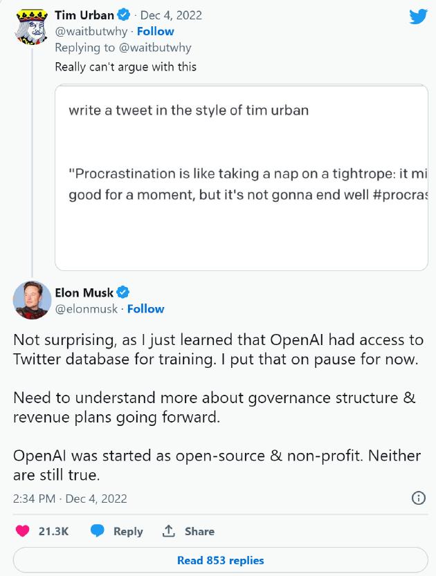 之后马斯克在推特上表示,在得知OpenAI正在使用推特的数据库来“训练”该工具后,他暂停了OpenAI对推特数据库的访问。他写道:“这并不奇怪,因为我刚刚得知OpenAI可以接入推特数据库进行训练。我现在暂停了这个项目。我需要进一步了解其治理结构和未来的收入计划。OpenAI刚开始的时候是以开源和非营利性的方式存在的,然而现在这两个特性都已经不在了。”