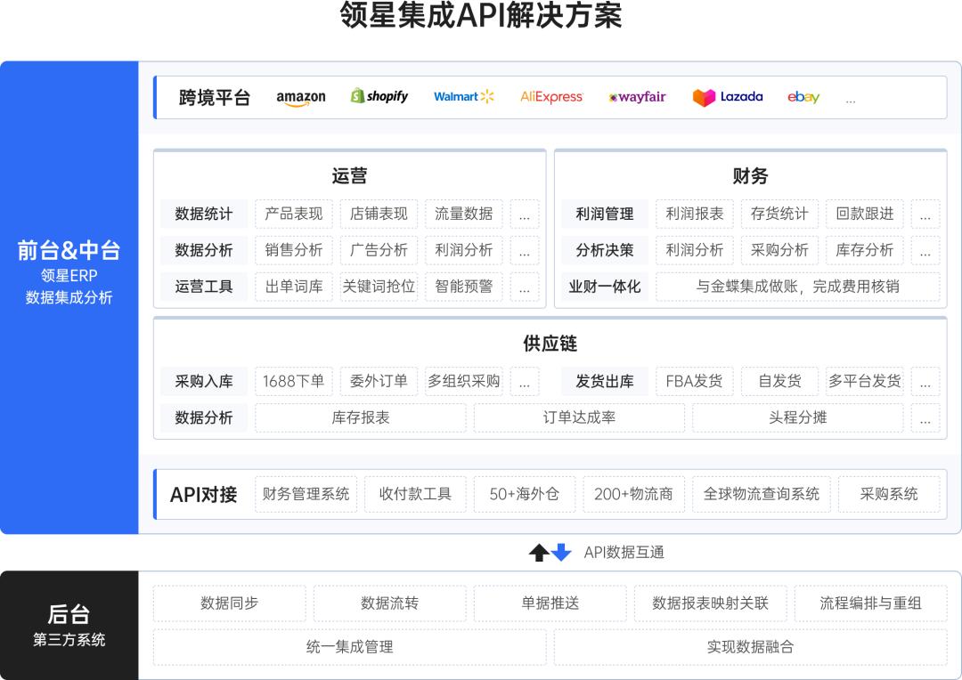 通过领星ERP的API集成方案,跨境电商企业可轻松融合与应用各节点业务数据,辅以业务决策,避免重复造轮,大幅降低研发成本,释放更多精力,专注业务提升。
