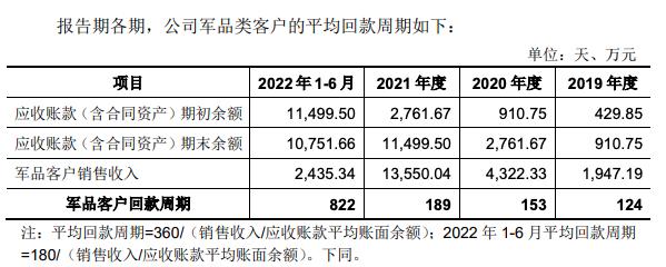 2019年至2022年上半年,博华科技军品客户回款周期不断延长,分别为124天、153天、189天、822天。