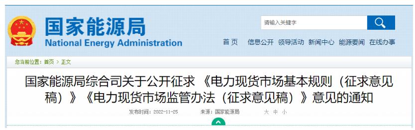 11月25日,国家能源局发布了《电力现货市场基本规则(征求意见稿)》(以下简称《基本规则》)、《电力现货市场监管办法(征求意见稿)》。