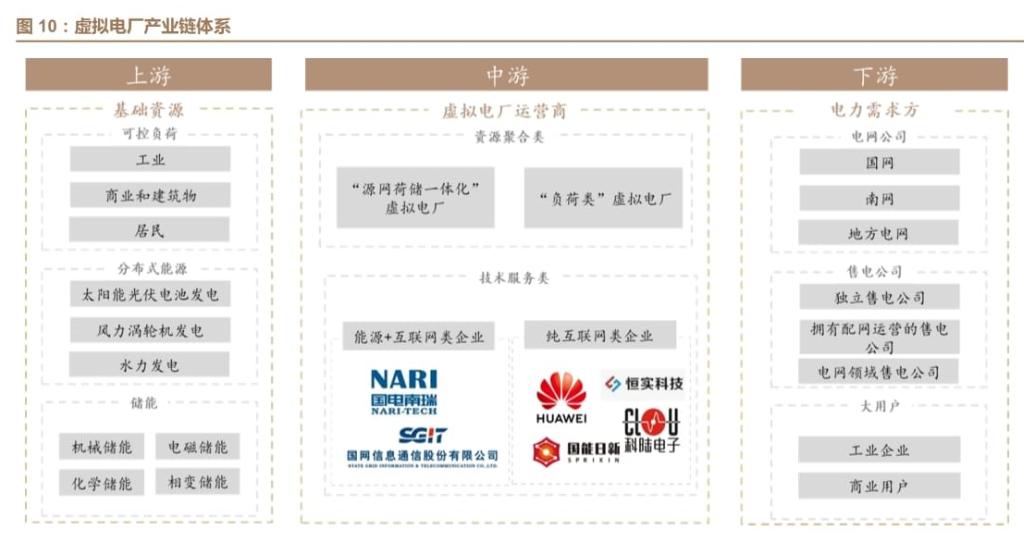 要知道,虚拟电厂产业链主要由上游基础资源、中游系统平台和下游需求方构成: