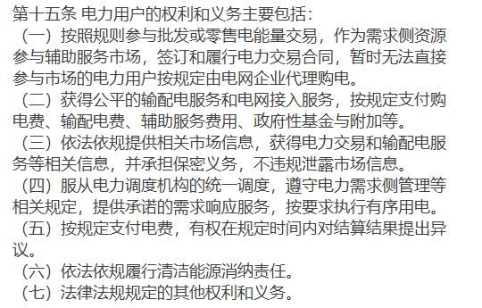 而从下游电力需求方来看,《基本规则》中电力用户的权利和义务也明确了。业内人士称,这是第一次如此明确地描述用户侧在需求响应方面的义务,同时还提出依法履行清洁能源消纳责任。