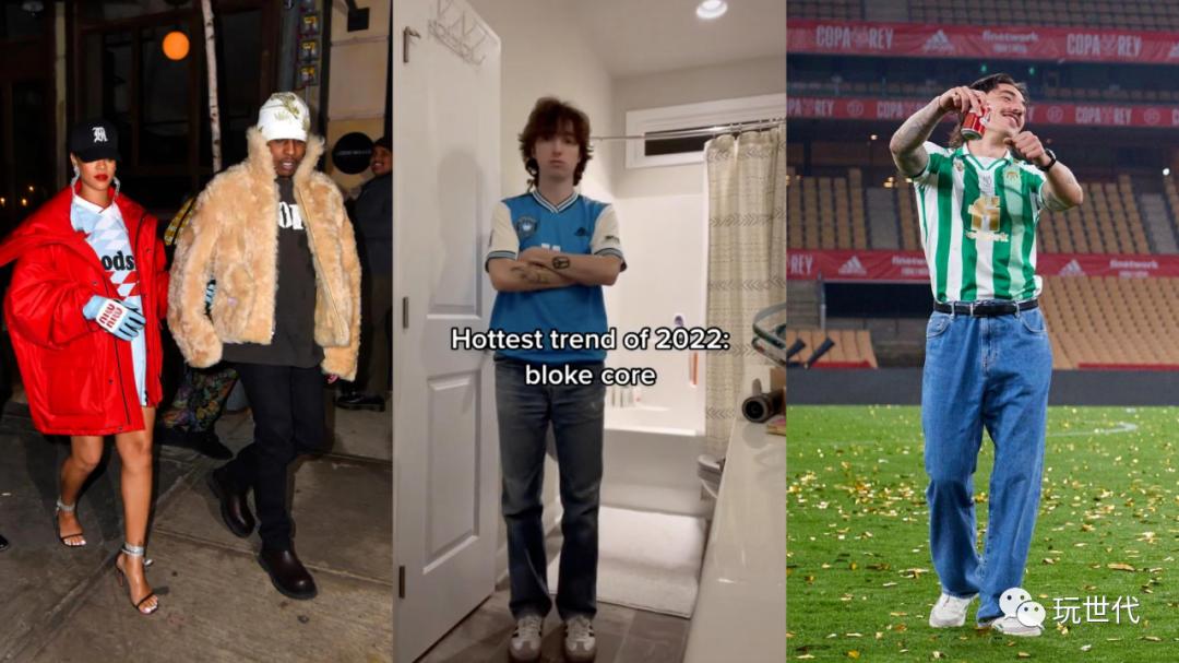 前有Rihanna、超模Bella Hadid等明星“带货”,后有潮流博主们偷师70年代英国酒吧里“老球棍”,BlokeCore风格公式应运而生——“老球衣+牛仔裤+复古球鞋”,精髓是把球衣下摆塞到裤子里。
