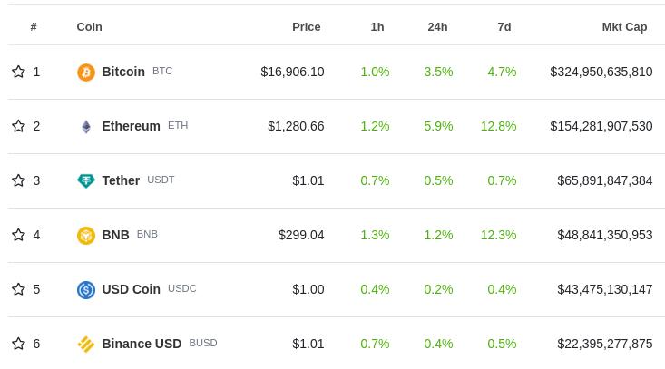 顶级加密货币市值,来自 CoinGecko 的数据,2022-11-30。前六名中的三个是中心化稳定币。
