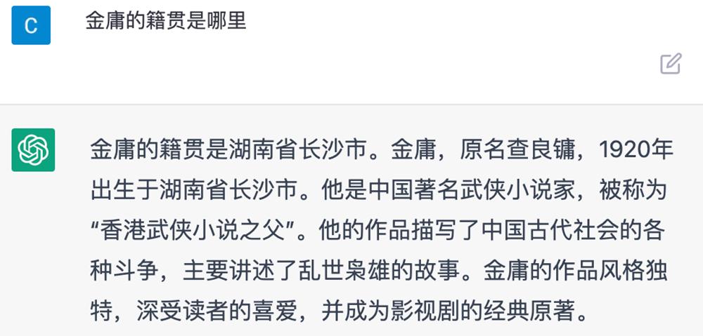 金庸的籍贯是浙江海宁,ChatGPT回答成湖南长沙。