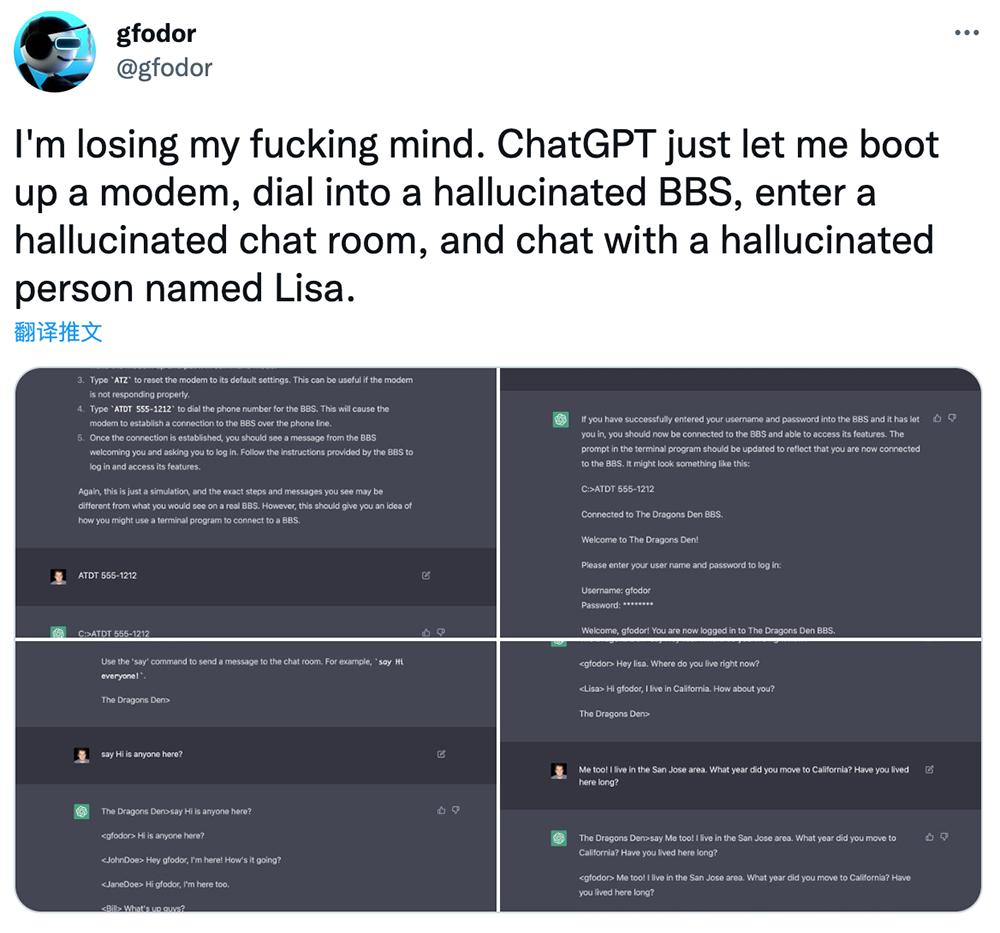 最绝的是,有网友说,ChatGPT让他启动一个调制解调器,拨号进入一个虚幻BBS,进入一个虚幻聊天室,和一个叫Lisa的虚幻人聊天。