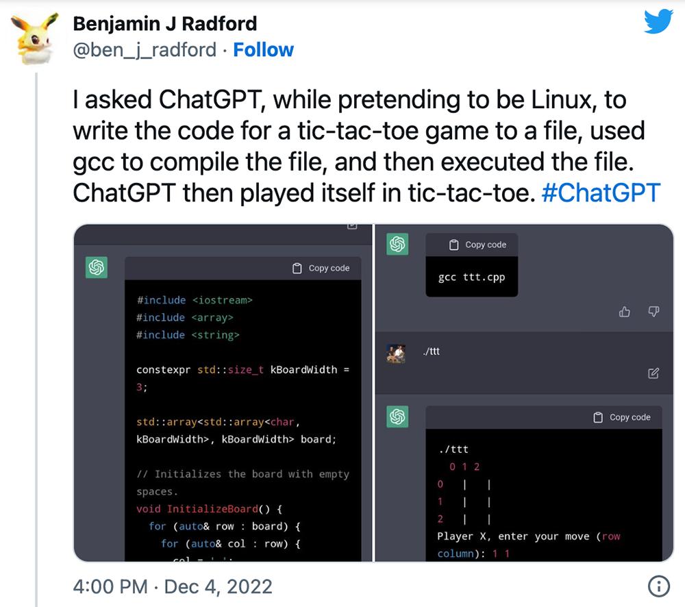 机器学习爱好者、UNCC助理教授Benjamin J Radford让ChatGPT假装是Linux,将一个井字棋游戏的代码写入文件,用gcc编译这个文件,然后执行,接着ChatGPT自己玩井字棋游戏。