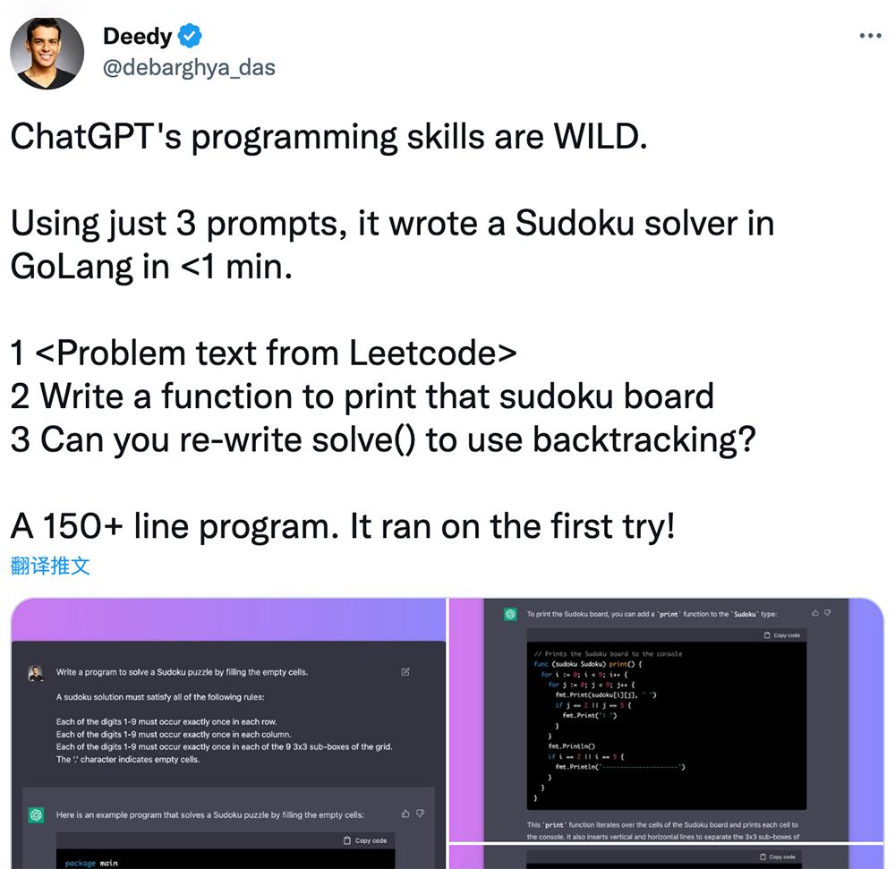 一位工程师Deedy称赞说ChatGPT的编程技巧非常棒,仅用3个提示,它就在1分钟内用GoLang编写了一个数独求解程序。一个150多行的程序,第一次试就成功了!