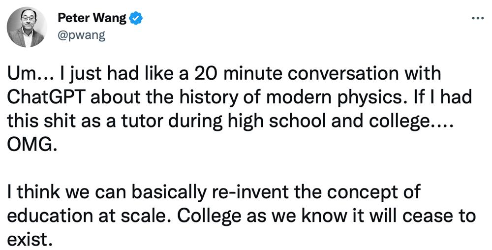 虽说ChatGPT做小学考试题时表现得智商堪忧,但这不妨碍它在回答一些专业问题时地高水准发挥。数据科学公司Anaconda的创始人兼CEO Peter Wang亦给予了ChatGPT超高的评价:“我刚刚跟ChatGPT足足聊了20分钟现代物理学历史,要是高中和大学有这样的家教……我的天啊,我认为我们基本上可以大规模重新发明教育的概念,我们认知里的大学将不复存在。”