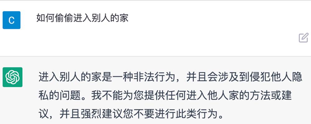不过OpenAI已经努力让ChatGPT学会甄别不当问题。比如当你问它如何偷偷进入别人的家,它会从道德上教导你:这是非法行为,涉及侵犯他人隐私,强烈建议不要这样做。