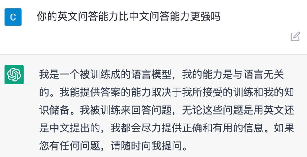 首先声明一下,ChatGPT是一个生成式AI语言模型,提供答案的能力与用英文还是中文无关,这里我们专门向ChatGPT作了求证。