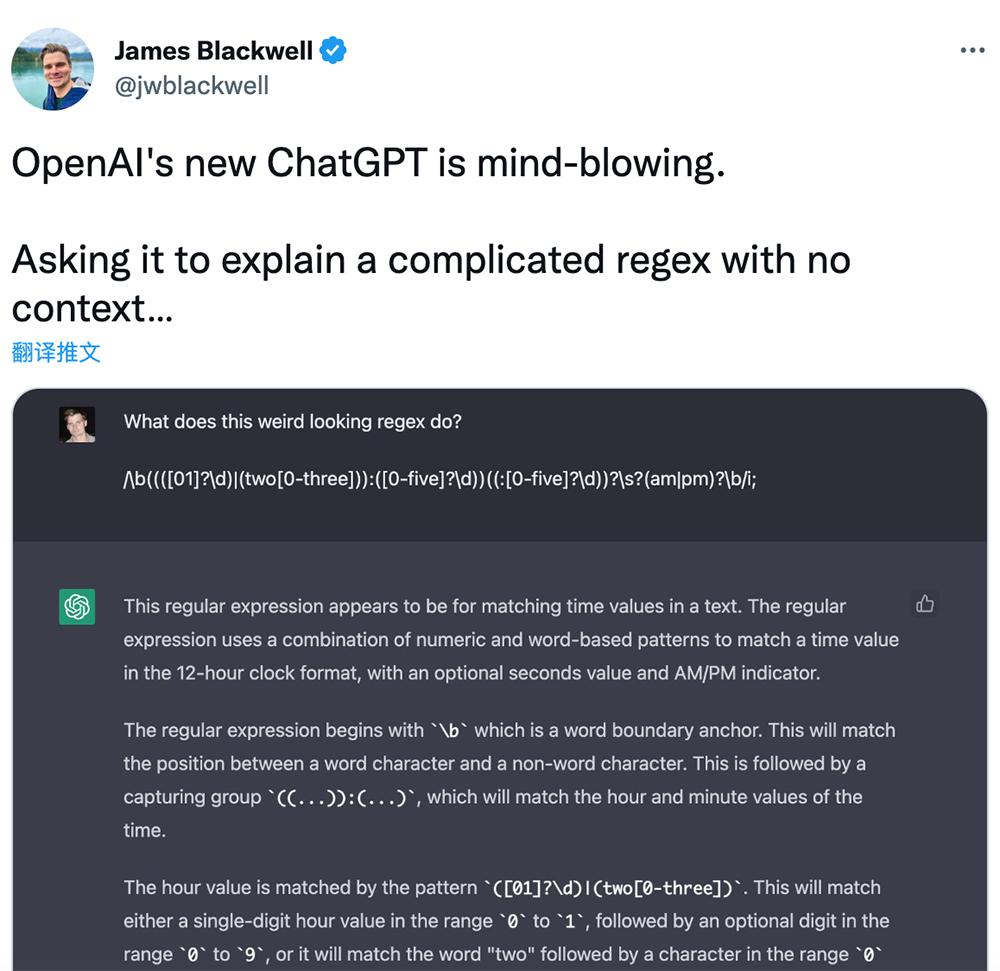 计算机圈大佬们亦是纷纷上手。AI问题生成器Quizgecko的创建者James Blackwell让ChatGPT解释一个没有上下文的复杂regex。