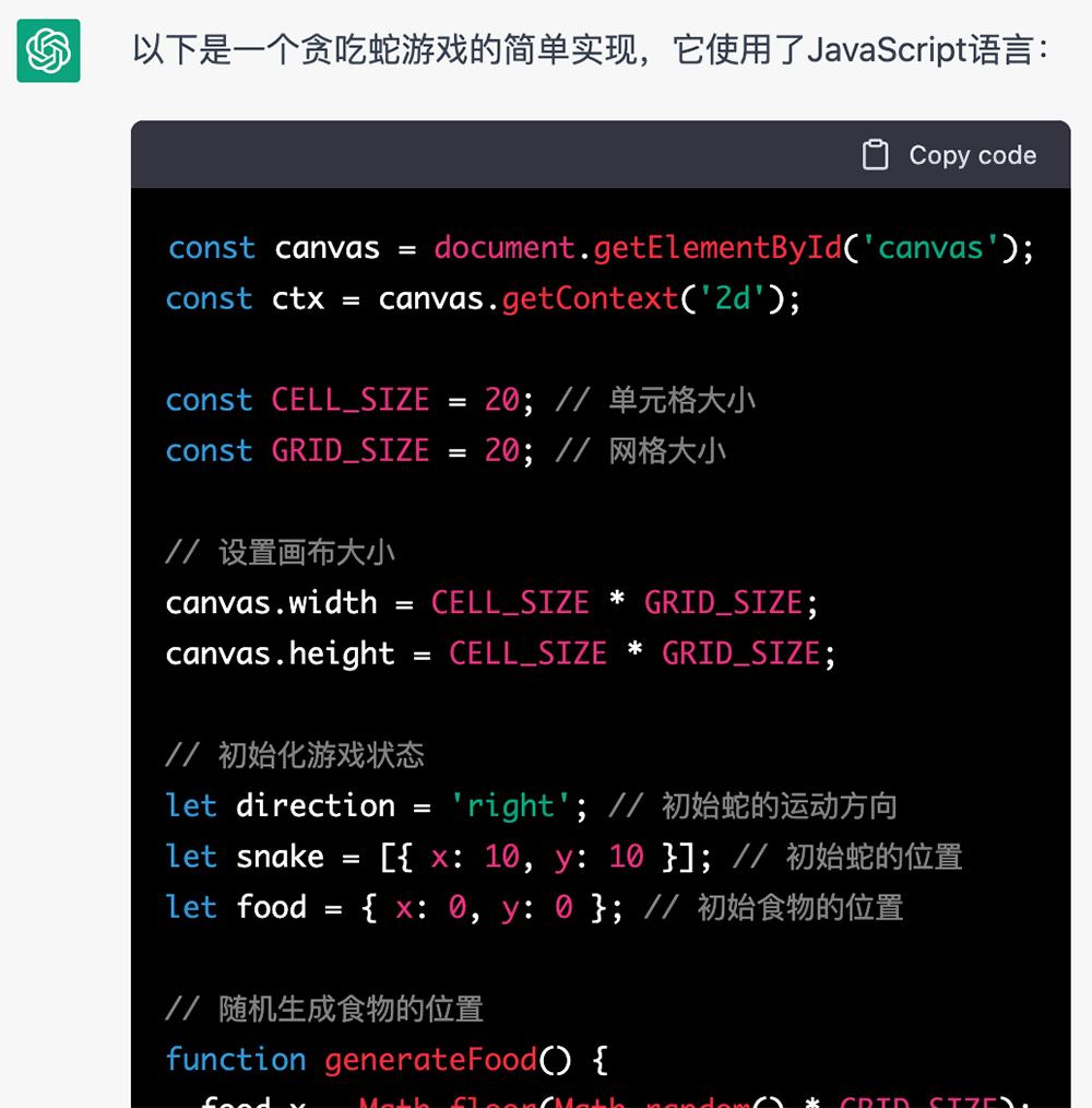 先抛转引玉,我简单体验了一把零代码编程的快乐,让ChatGPT写一个贪吃蛇游戏的程序。