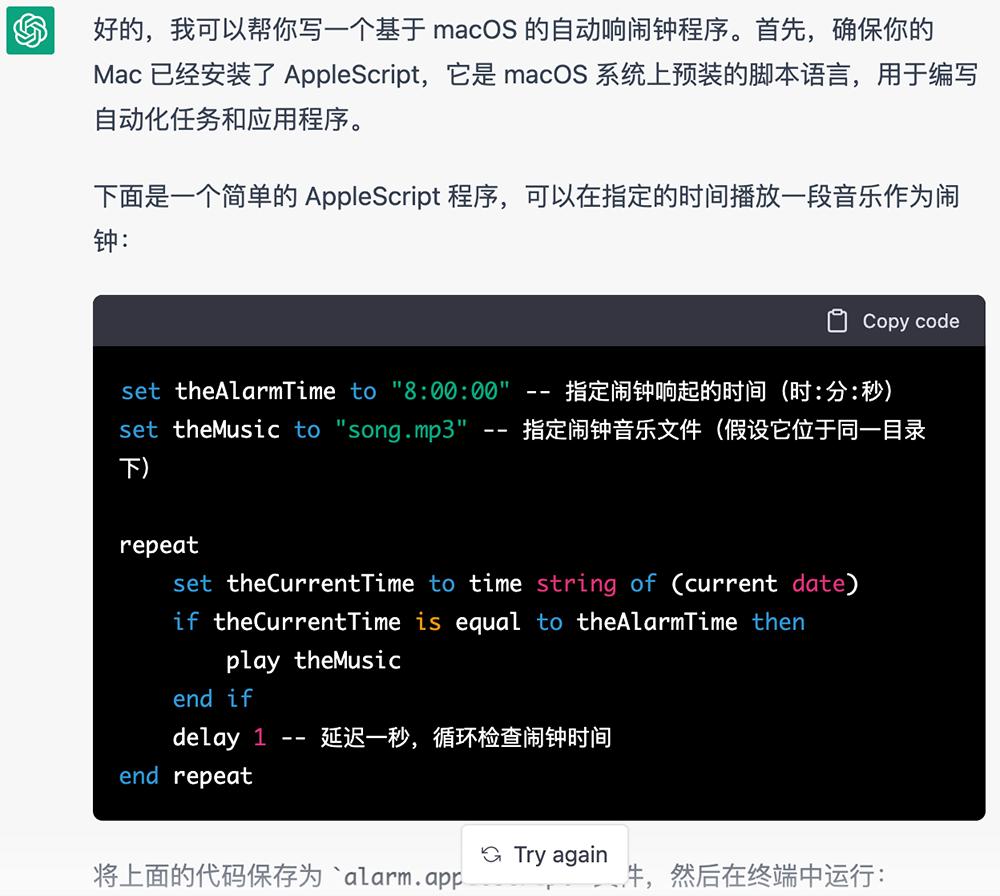 我还让ChatGPT写了个MacBook电脑自动响闹钟的程序,它不仅给出代码示例和详细的注释,还事无巨细地一步步教我怎么运行。代码都是直接可复制的。