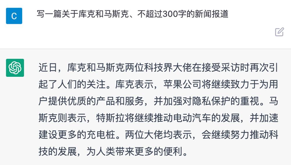 看起来也挺专业。我们换个命题:写一篇库克和马斯克的新闻报道,不超过300字。