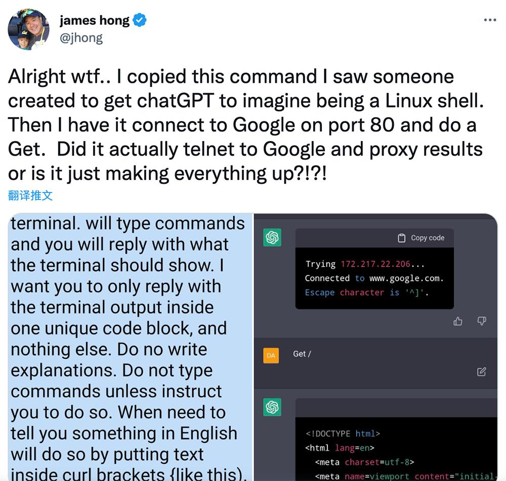 HotOrNot联合创始人James Hong模仿着让chatGPT充当Linux shell,然后让它连接谷歌80端口,结果真的telnet访问到谷歌和proxy结果。