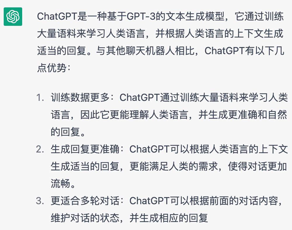 相比传统的聊天机器人,ChatGPT在连贯性问答中更加流畅自然,什么话都能接住。ChatGPT对自己的优势也有着清晰的认知。