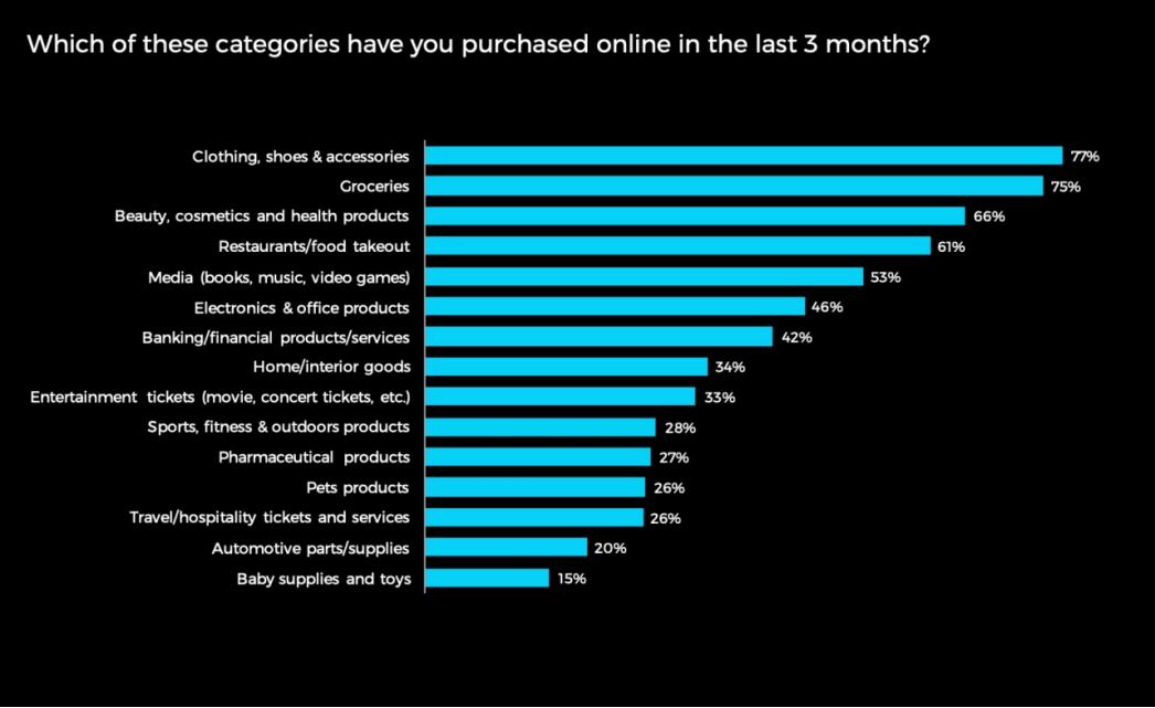 韩国人是比较“爱美”的,在过去的3个月里,77%的受访韩国网购消费者购买了鞋服产品,66%的消费者购买了美妆、保健品。而购买健身用品的消费者又28%的比例。